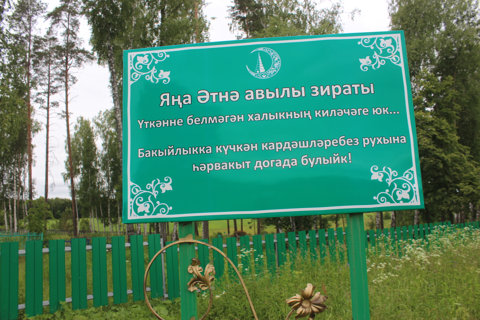 Выйдя из машины, я растерялся: деревни нет, но и ничего заброшенного здесь нет. Трава скошена, всюду чувствуется человеческий труд! Первым делом обратил внимание на благоустроенное кладбище. Снаружи установлен огромный гранитный памятник. Надпись на нем гласит: «На этой местности жили жители деревни Новая Атня (деревня была основана в 1760–1770 гг.)». Во въезде в деревню встречает дом из жести (по-другому назвать язык не поворачивается, потому что там всюду чувствуется порядок, как в доме). Рядом скамейки, столы. Меня удивило, что дом был открыт. Раньше удивлялся, как в Чувашии мечети всегда открыты. Говорили, что путники могут прочитать в них намаз и даже переночевать.