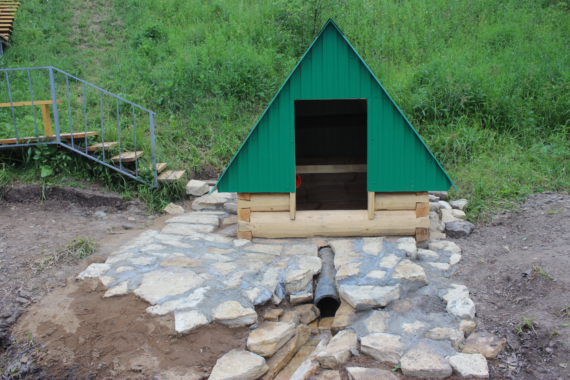По тропинке спускаемся к роднику. Открывающийся вид вызывает восхищение, по высокому склону по лестнице спускаешься к роднику, удивительно красивый домик у родника говорит о том, что жизнь здесь ни на минуту не остановилась, а течет своим чередом.