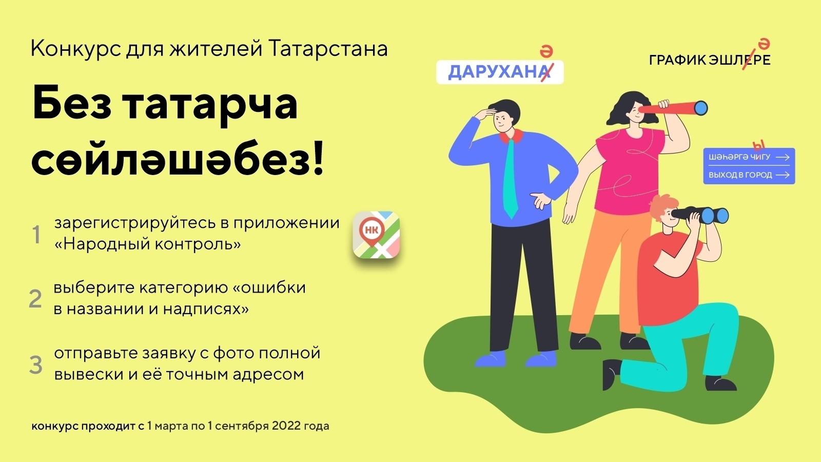 По инициативе Комиссии при Президенте Республики Татарстан по вопросам сохранения и развития татарского языка проводится конкурс по привлечению жителей республики к выявлению ошибок в названиях и надписях на вывесках, информационных табличках, топографических обозначениях, дорожных указателях и на аншлагах жилых домов на татарском языке.