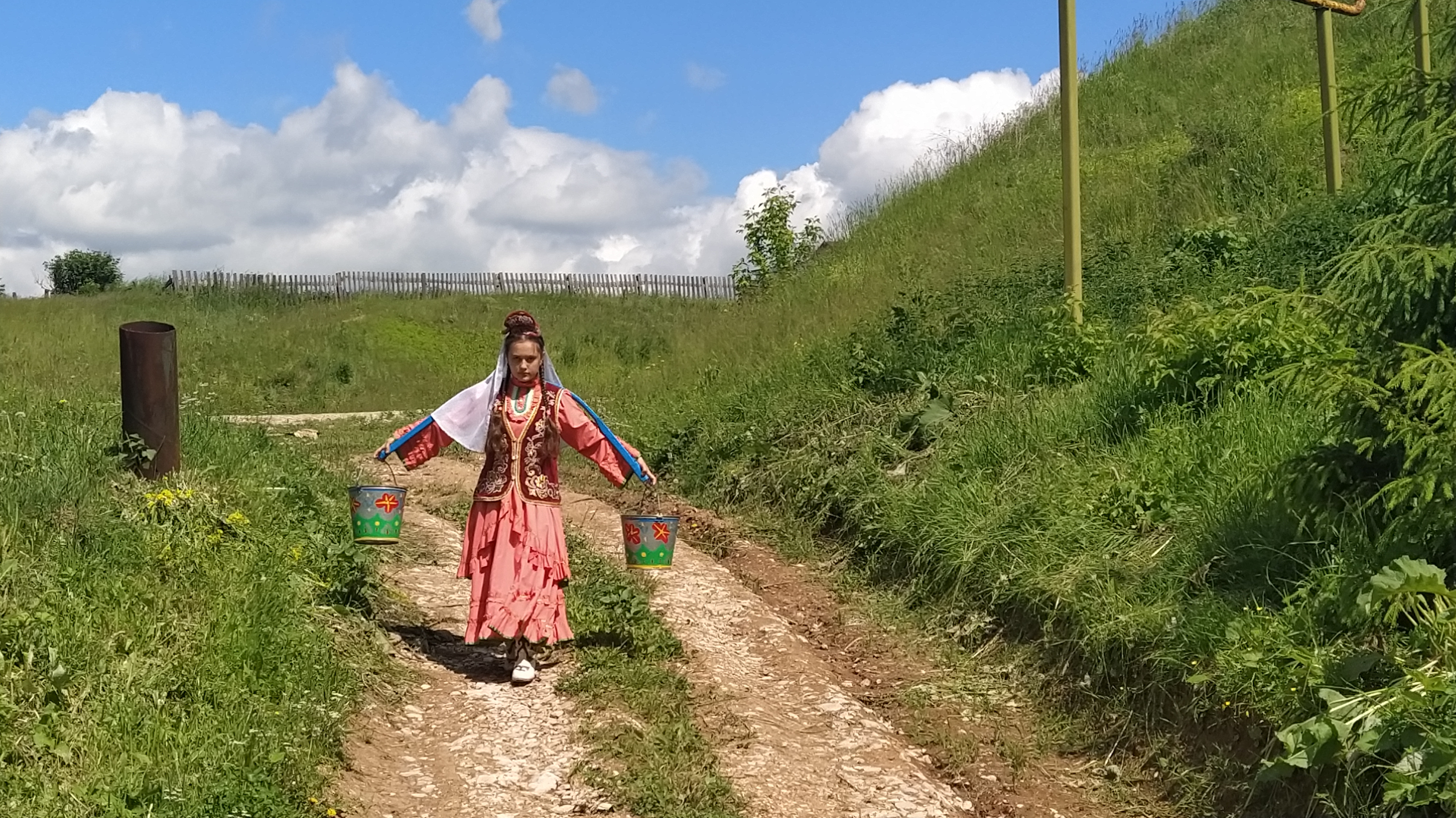 Фидалия Мухаметзянова и Гульназ Касимова запели песню «Җидегән чишмә». Им на гармони аккомпанировал глава Янга-Салского сельского поселения Айрат Сафин. Под их пение девушка в белом платке – Залия Ахмадуллина грациозными движениями наполняет ведра родниковой водой…