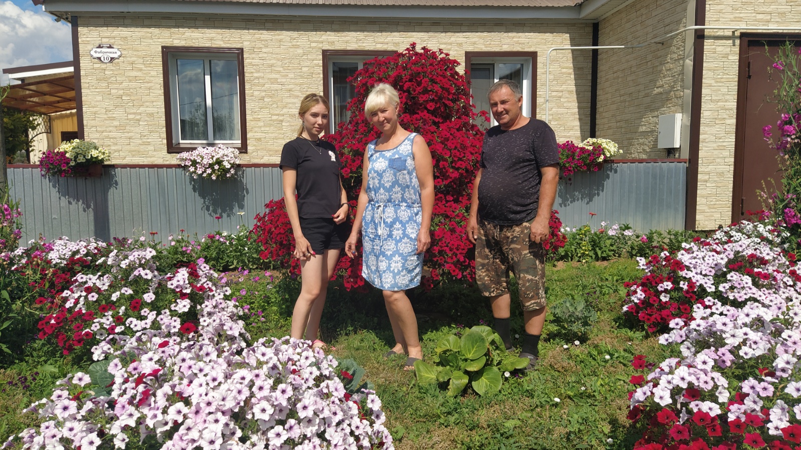 Кто же она? «Обязательно надо с ней познакомиться», – подумала я про себя. С этой целью направилась по нужному адресу. Очень легко нашли нужный дом. Прохожий мужчина все подробно объяснил. Им оказался муж Гульназ Фарит. Уже на придомовой территории сотворили такую красоту, что глаза разбегаются. Пройти мимо просто невозможно! Цветы! Как же я люблю петунии. А здесь их огромное количество. По центру сделали «дерево» из ампельных петуний темно-розового цвета. Такую необыкновенно красивую композицию они создали из 19 кашпо петуний.