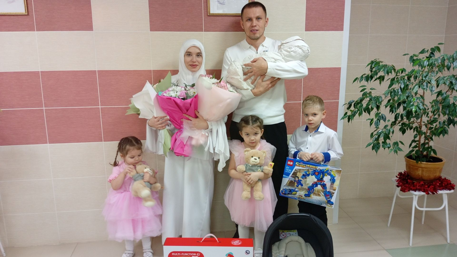 Мальчик весом 3 килограмма 560 граммов. Ему дали имя Ибрагим. В семье это четвертый ребенок. Семилетний Ислам, четырехлетняя Дина и двухлетняя Амина также пришли встретить своего младшего брата.
