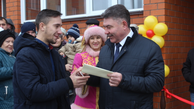 Яңа фатирларның ачкычларын район башлыгы Илшат Нуриев, ТР Президенты каршындагы Дәүләт торак фонды җитәкчесе урынбасары Булат Гыйльманов тапшырды.