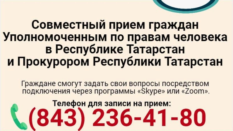 2020 елның 14 июлендә Татарстан Республикасында Кеше хокуклары буенча вәкаләтле вәкил һәм Татарстан Республикасы Прокуроры тарафыннан видеоэлемтә режимында гражданнарны бергәләп кабул итү планлаштырыла. Республиканың муниципаль районнарында яшәүчеләрнең «Skype» яки «Zoom»программалары аша турыдан-туры тоташтыру юлы белән үз сорауларын бирү мөмкинлеге бар.