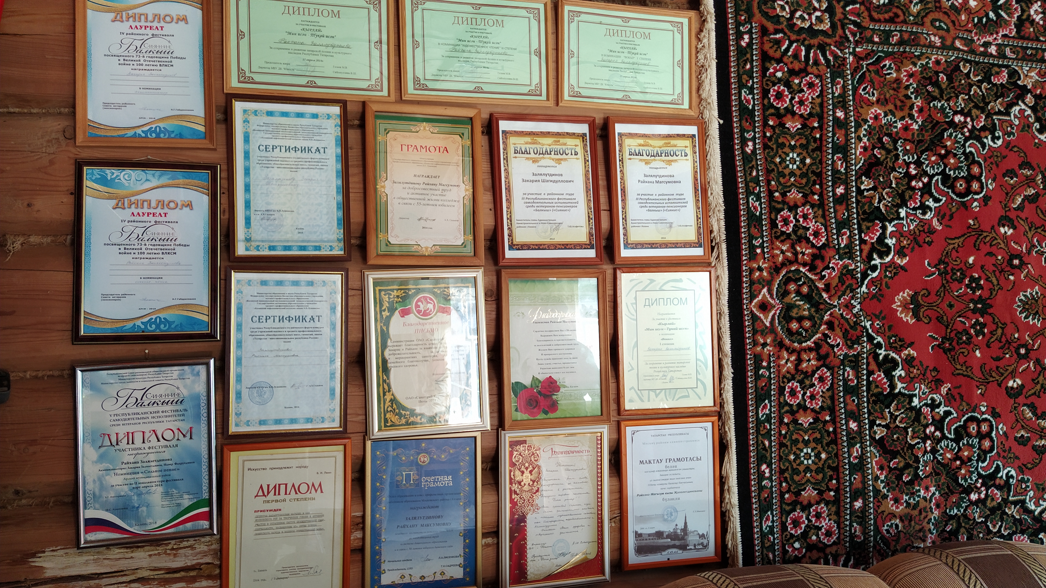 Күрешкәч, сөйләшә-көлешә ишегалдына уздык. Анда үзе бер рәхәт манзара: аллы-гөлле чәчәкләр, тирә-юньгә мәдхия җырлап йөргән тавыклар... Шау-гөр килеп, фотоларга төшә-төшә өйгә кердек. Агач өй, агач идәннәр. Һавасы да һавасы! Түр яктагы стеналар Мактау кәгазьләре, Дип-ломнар, Рәхмәт хатлары белән тулы. Җыр фестивальләрендә, үзешчән композиторлар конкурсларында җиңүләр – кайсын карарга белмисең – алар күп. Гомер буе Казанда яшәп, лаеклы ялга чыккач, Зәкәриянең туган нигезе Үгез-Елга авылына күченеп кайталар. Зәкәриянең әти-әнисен карап-тәрбияләп, соңгы юлга озаталар.