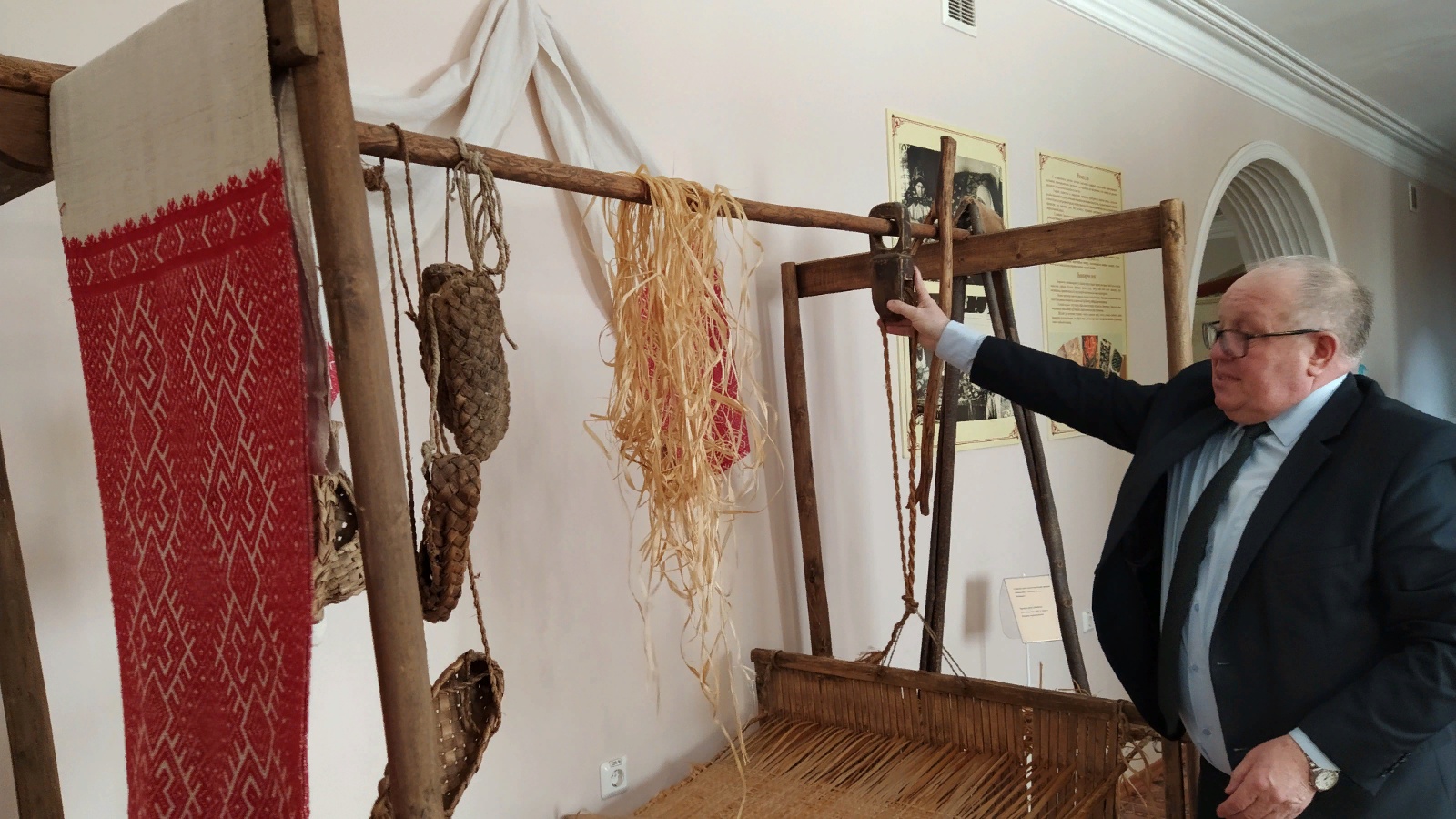 Ш.Гарипов музейдагы махсус станок янына басып, ничек эшләгәннәрен дә күрсәтте. Туку станогына ошаган ул. Тик монда ике яктан кеше баса. Берсе калакчы, икенчесе инә бирүче. Мунчаланы буй-буй итеп салалар, кылыч тишекләре аша үткәреп беркетәләр. Иң авыры шул кылыч аша үткәрү булган. Аннан станок баганасына бәйләнә. Аркылыга энә җебенә эләктерәләр һәм чыпта инәсе белән тартып алып, калак белән сугалар. Өске якта чыгыр дигән әйбер бар. Ул хәрәкәтләнә – күтәрелә, төшерелә, аның белән бергә кылыч та хәрәкәткә килә.