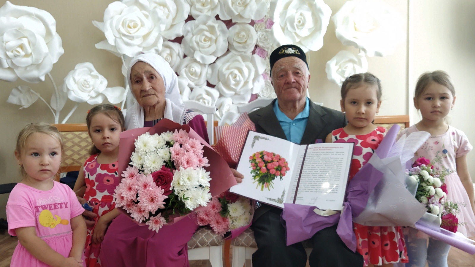 Зәкия апа белән Мансур абыйны балалары, оныклары, оныкчыклары котлады. Кечерәк кенә буйлы, кызларныкы кебек нәфис гәүдәле Зәкия апа чәчәк бәйләмнәре арасында күмелеп үк калды.