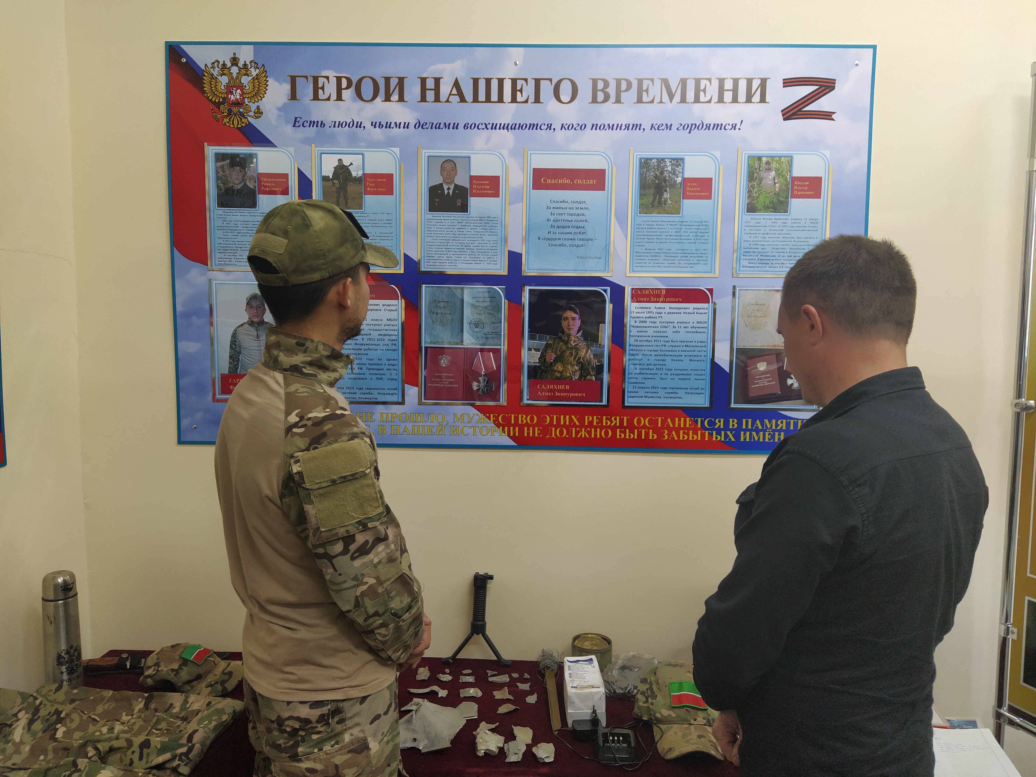 – Без алар белән бергә махсус хәрби операция барган зонага киттек. Бер үк көнне 24 сентябрьдә мобилизацияләндек тә. Бер взводка эләктек. Мин сок-лана идем аларга. Кайчан карама, сугышчан рух, күтәренке кәеф. Бик уңган кешеләр дә иде. Тиз дуслашып киттек. Хатыннар да гел аралашып торды. Соңыннан да гаиләләр белән йөрешер идек тә... Тик, кызганыч, безнең арада юк шул инде алар. Якташлары егетләрне онытмавына, исемнәрен шушы музей почмагында мәңгеләштерүенә мин бик шат.