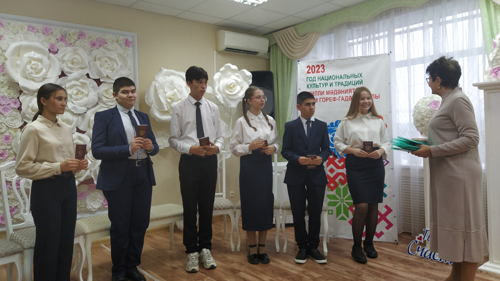Паспортларны Россия Эчке эшләр министрлыгы Арча эчке эшләр бүлегенең миграция мәсьәләләре буенча бүлекчә җитәкчесе вазыйфаларын вакытлыча башкаручы Гөлира Галләмова тапшырды. Район хатын-кызлар советы җитәкчесе Альмира Гатауллина балаларга теләкләрен җиткерде, истәлеккә илебезнең төп документы булган Россия Федерациясе Конституциясе китабын тапшырды.