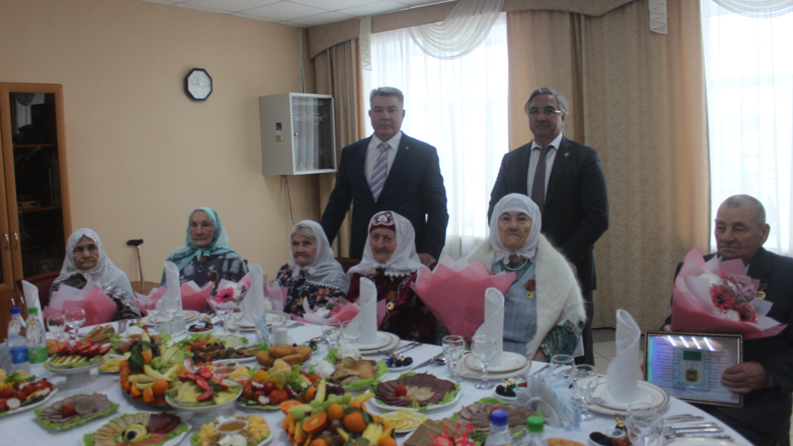 Аннан соң В.Шәйхразыев белән И.Нуриев бер төркем ветераннарга тантаналы шартларда “1941-1945 еллардагы Бөек Ватан сугышында Җиңүгә 80 ел“ юбилей медальләрен тапшырдылар. Беренче булып зур бүләкне Бөек Ватан сугышы ветераны Тәлгать ага Ногманов алды. Аңа “Арча районының шәрәфле гражданины“ дигән мактаулы исем бирелү турындагы таныклык та тапшырылды.